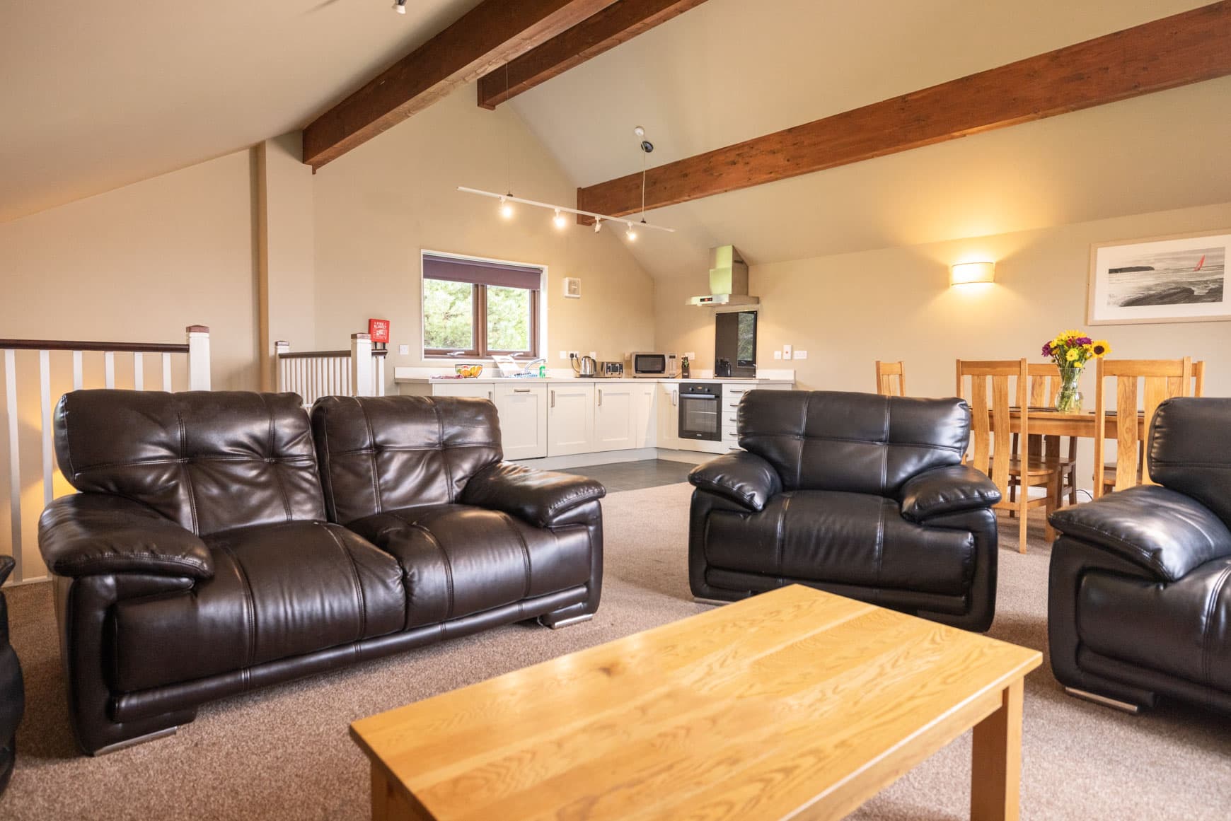 Upside down lodge with a large open-plan kitchen diner and living room with Juliet balcony for a great view of the resort.