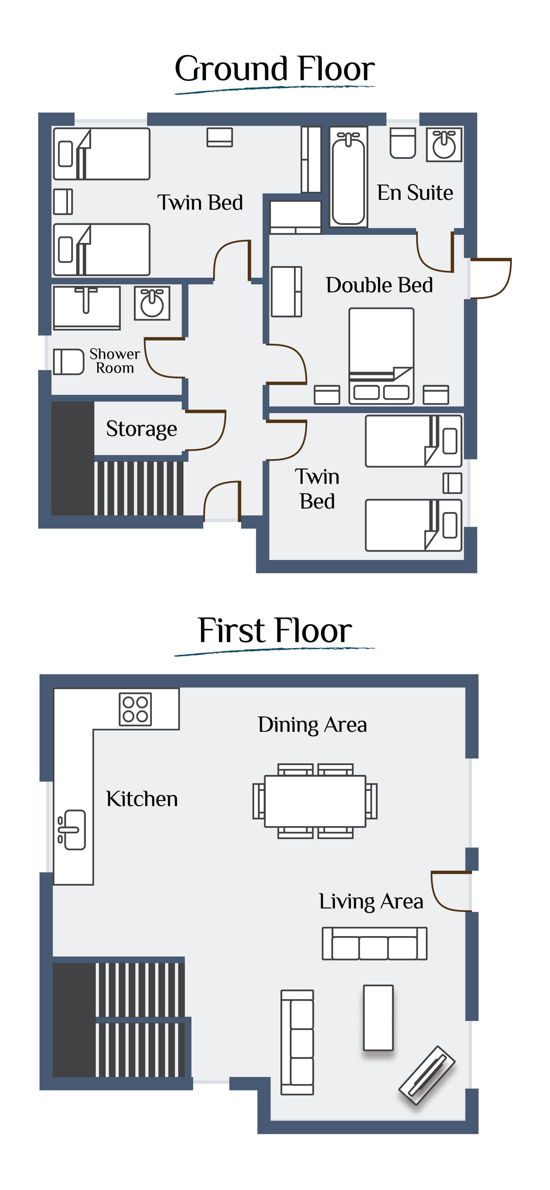 The ground floor has two twin beds that share a bathroom and shower, and the double bed has an en suite with bath to soak in. Plus a decking area outside to enjoy morning coffee.